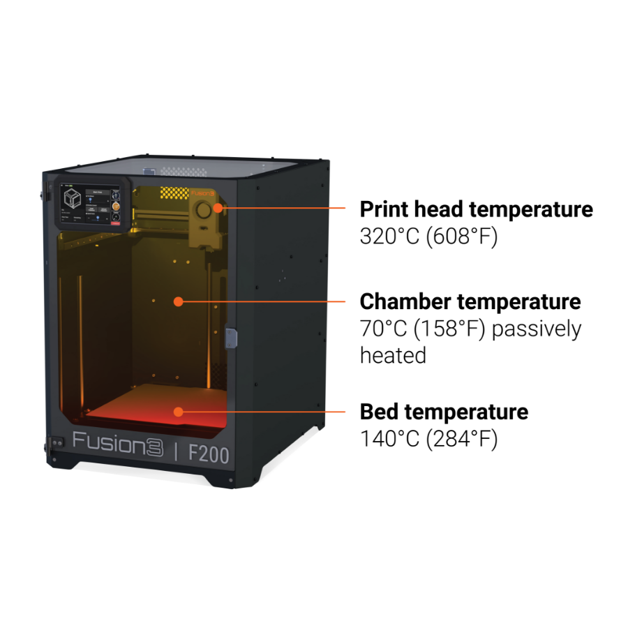 Withstands a maximum bed temperature of 140°C (284°F), a print-head temperature of 320°C (608°F), and a chamber temperature of 70°C (158°F). The F200’s high-temperature durability makes it compatible with more than 150 engineering-grade materials—far exceeding the limits of traditional hobbyist printers.